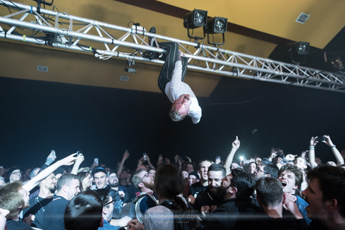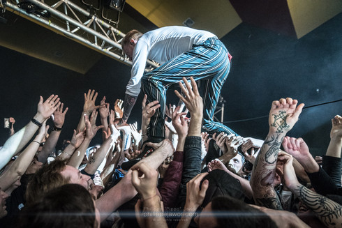 Non pas que le Marché Gare soit une mauvaise salle. Mais longtemps nous nous sommes demandés pourquoi Frank Carter, auréolé de disques à succès et de tournées triomphales – il aura notamment été programmé au Hellfest et à Rock en Seine l'an dernier – a choisi de jouer dans une salle de 300 places au lieu de viser plus "gros". Et puis, dès que les premières notes de "Trouble" retentissent, tout s'éclaire : un lieu aussi compact, c'est un formidable catalyseur d'énergie ! Carter et son gang arpentent la scène sans relâche, le public bouge dans tous les sens, précipitant les premiers rangs contre la scène, avant que ce ne soit l'intenable frontman qui parte à sa rencontre dans un de ses exercices favoris : l'escalade ! En moins de temps qu'il ne faut pour le dire, il pend déjà à la rampe de spots au milieu de la fosse, alors qu'on n'est qu'au deuxième morceau de la setlist ! Dès lors, c'est un déluge d'énergie : les femmes sont invitées sur scène pour "Wild Flowers", avant qu'un circle pit ne soit envoyé dans les couloirs du Marché Gare pour qu'il passe par les deux portes qui donnent accès à la salle ! Toujours aussi dingue, le set se terminera, comme une habitude, sur un "I hate you" qui ne perd jamais de son efficacité, nous laissant – ainsi que 300 autres personnes, sur les rotules. Énorme !